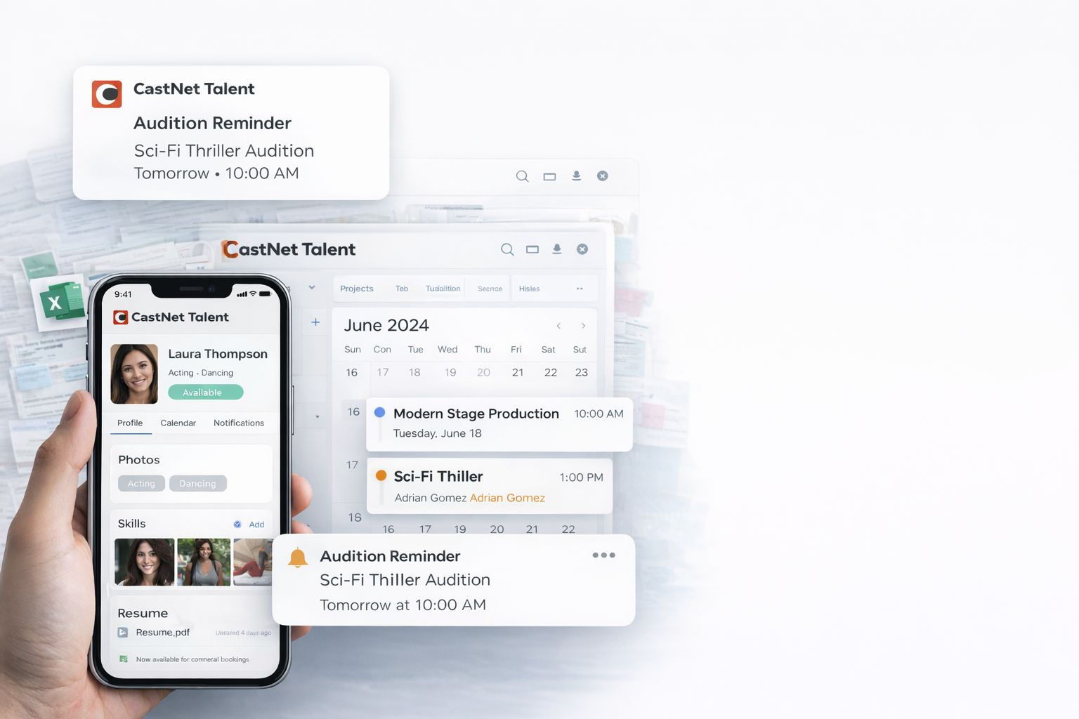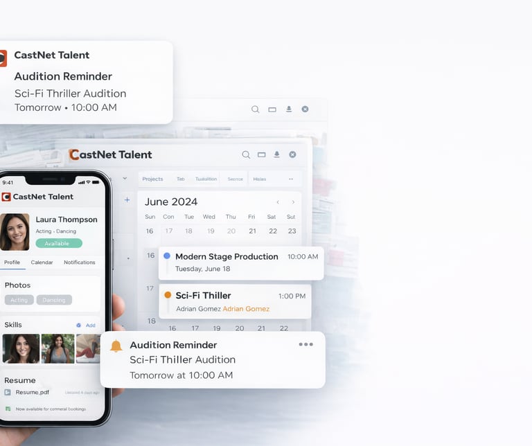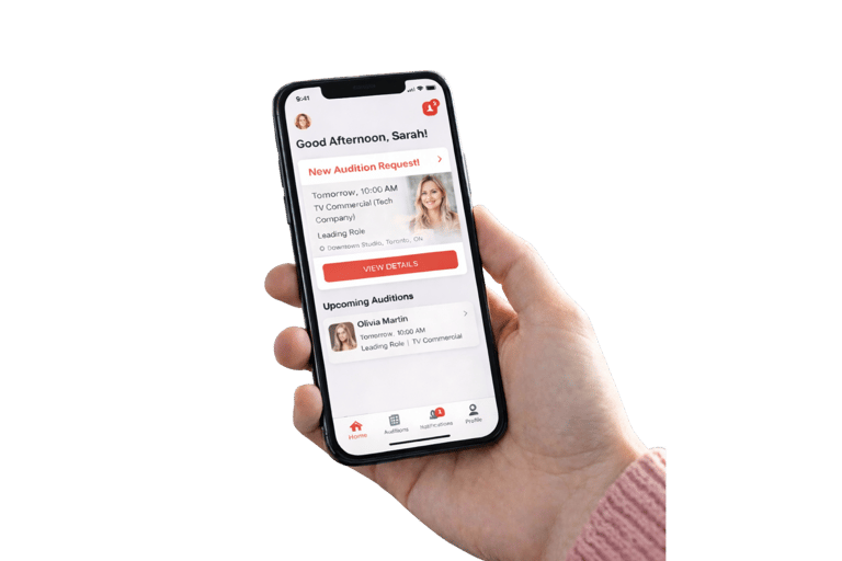 Actors and performers can log into their profile to update photos, resumes, skills, and availability. Talent can view auditions, manage calendars, and receive automatic reminders and push notifications so they never miss an opportunity.