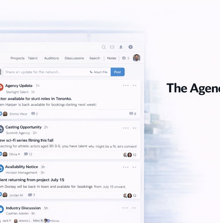 A private industry hub exclusively for agencies on the CastNet Talent platform. Here, agents can share updates, discuss talent availability, and stay informed about opportunities across the network. Because access is limited to agencies within CastNet Talent, the platform creates a trusted professional space that grows more valuable as more agencies join.